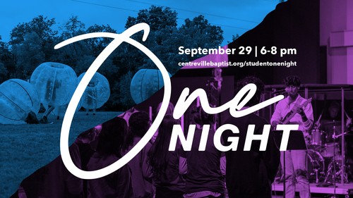 One Night is on September 29 from 6:00-8:00 pm! Join us on the front lawn at CBC for Bubble Soccer, Volleyball, an Ice Cream Truck, Hot Dogs, Popcorn, and other fun activities.