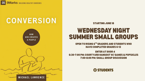 Starting June 18, plan to join us for small group discussions based on the book Conversion: How God Creates a People by Michael Lawrence.