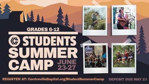 This year, the CBC Student Ministry is partnering with Del Ray Baptist Church in Alexandria for summer camp. Garrett Kell, Lead Pastor of Del Ray Baptist Church, will be speaking. The theme for this year's camp is Abide in John 15.